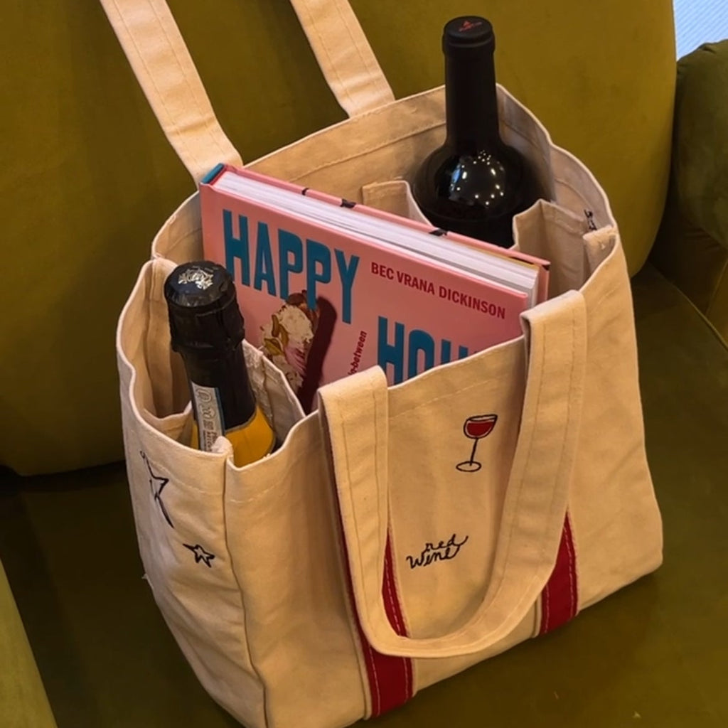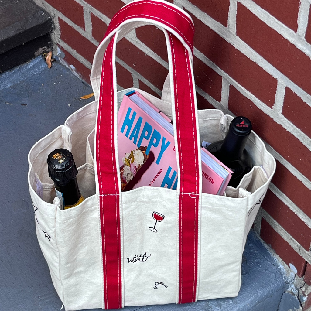 Carry your wine in style with our custom embroidered wine tote! Room for 4 bottles and groceries, or 6 bottles of wine. Perfect for picnics, parties, or a day at the beach. Durable canvas material provides a sturdy tote for short and long treks to the wine store!