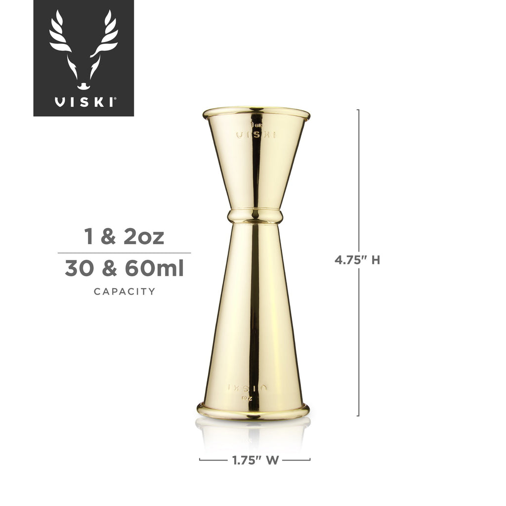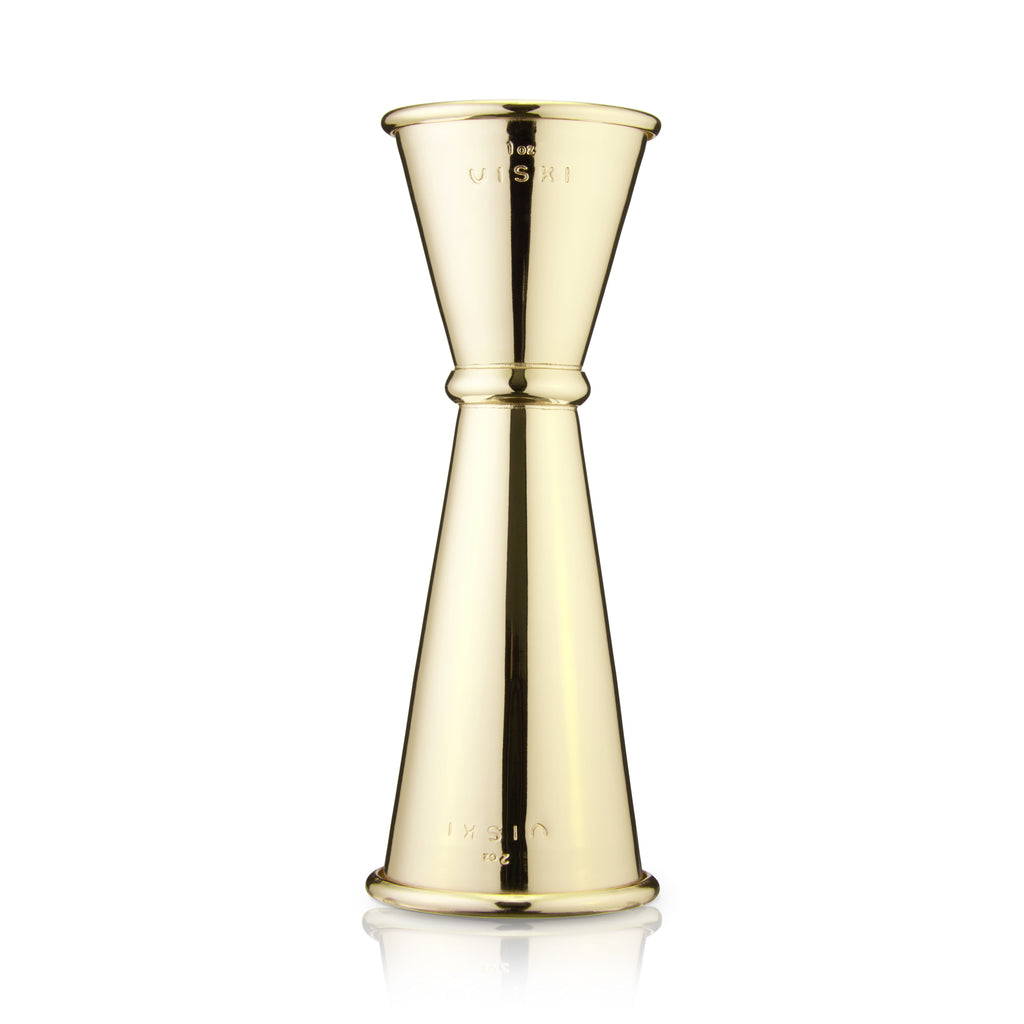 Cast in lustrous gold with a band that separates its one- and two-ounce sections, the interior of each side of our professional Japanese-style double jigger is scored with pinpoint mixology measurements (1.5, 0.75 and 0.5 ounces).