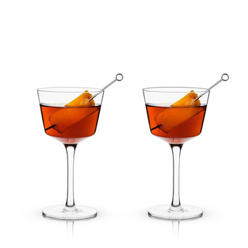 The Nick & Nora has enjoyed an illustrious history since its emergence in the cocktail kingdom. Highlighted against the backdrop of classical Hollywood cinema, the stemmed glass featured prominently in a six-part film series starring husband-and-wife duo Nick and Nora Charles that combined crime and cocktails on the silver screen. Re-imagined in a stunning modern silhouette, this set of spill-resistant glasses by Viski grants an elegant alternative to the standard martini glass and a daintier solution to their cousin the coupe.