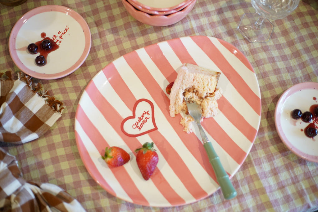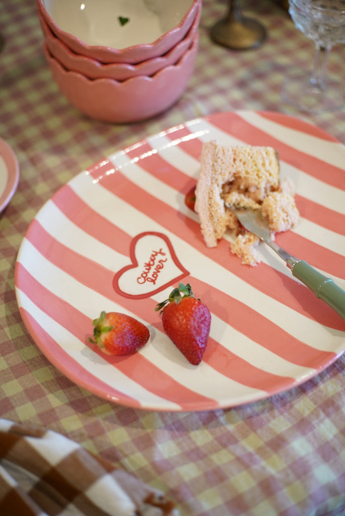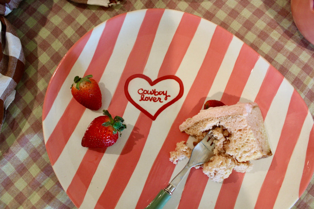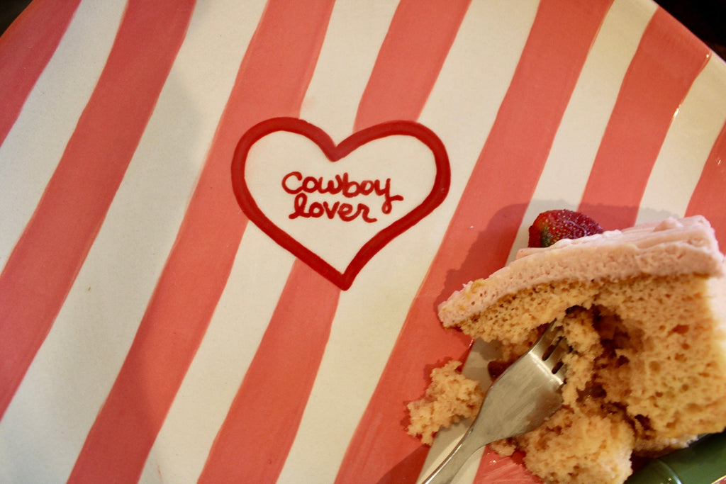Bring a touch of bright rustic charm to your home with this hand-painted ceramic Italian platter, proudly showcasing the bold words "Cowboy Lover" in a vibrant, eye-catching design.
