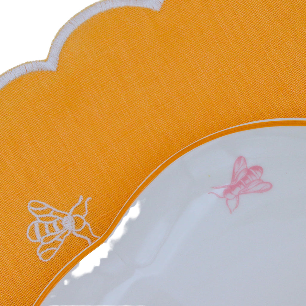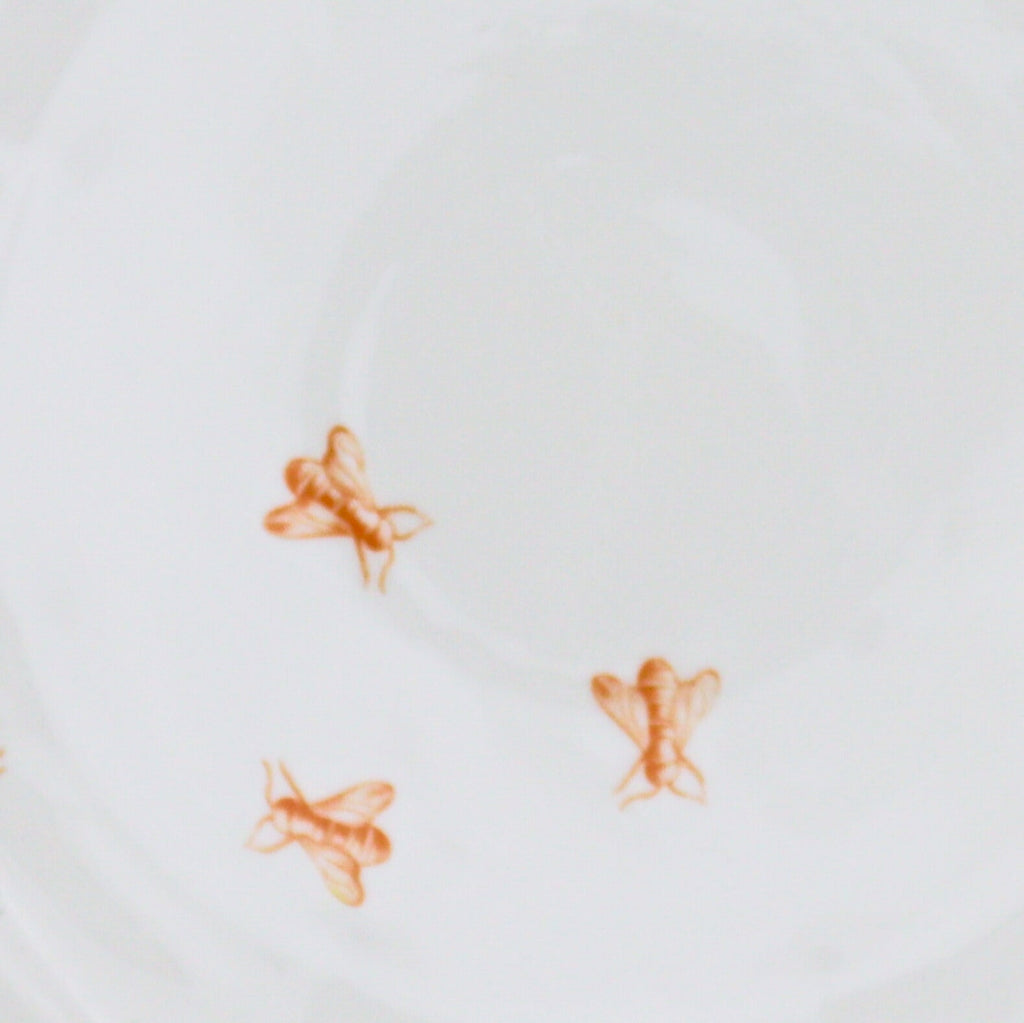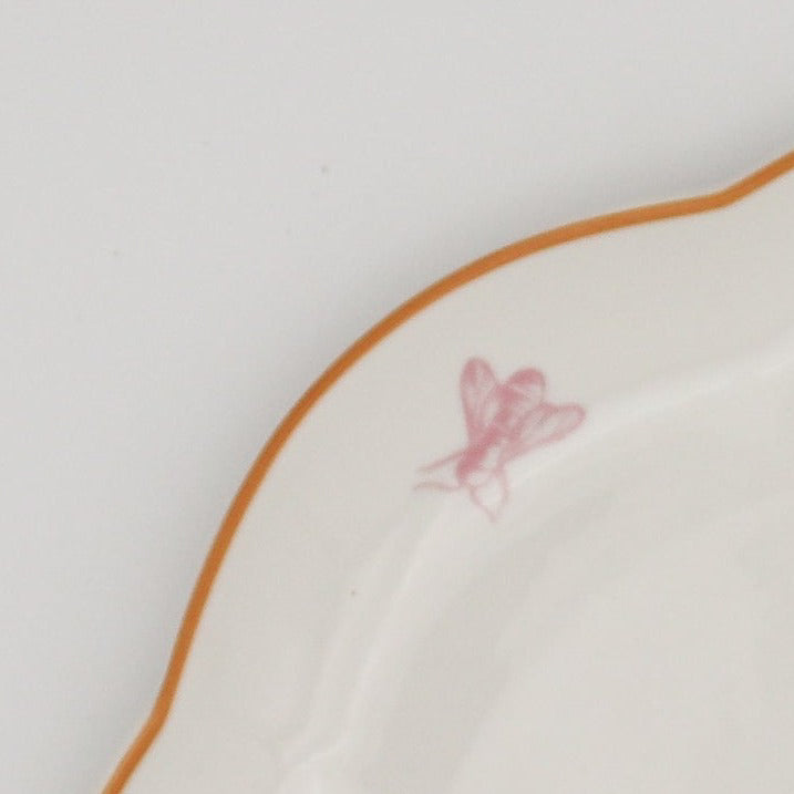 Effortlessly captures the delicate beauty of nature's most diligent workers - a quartet of finely sketched bumblebees embarks on their silent journey in honey gold and pink, hand drawn as if they are about to buzz right off the plate. The aerial ballet is accentuated by the plate's honey-gold rim, a nod to nature's golden nectar. Whether it's a sunlit breakfast or a candlelit dinner, the plate brings a touch of summer's fleeting beauty and the tireless dance of the bumblebees.