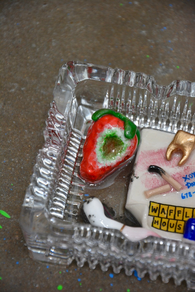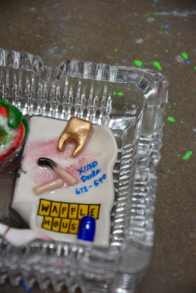 Oh Waffle House… a magical place where you can find just about anything in an ashtray - Featuring a cheeky love note from Darla on a "ripped" Waffle House “napkin”, discarded moldy strawberry, gold tooth, broken burnt matchstick, cigarette butt with lipstick stain, and a pill.