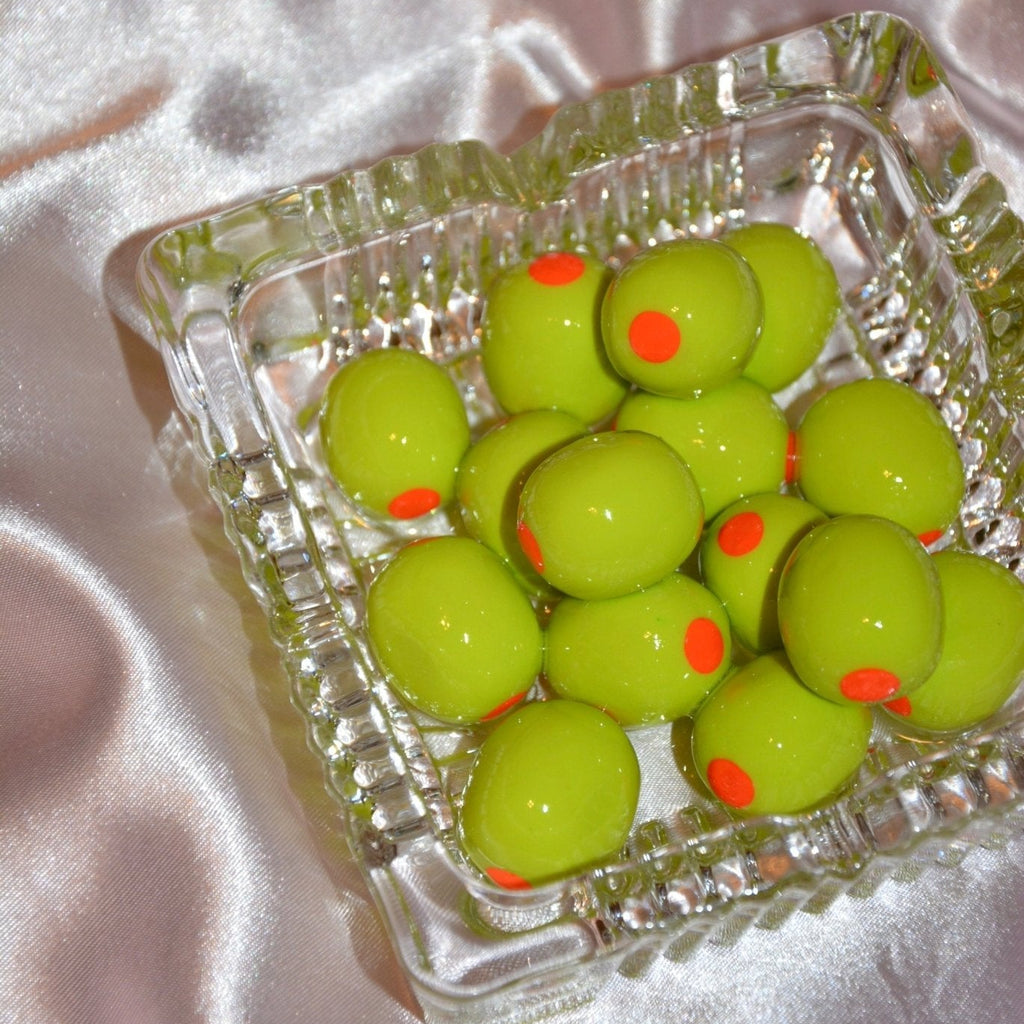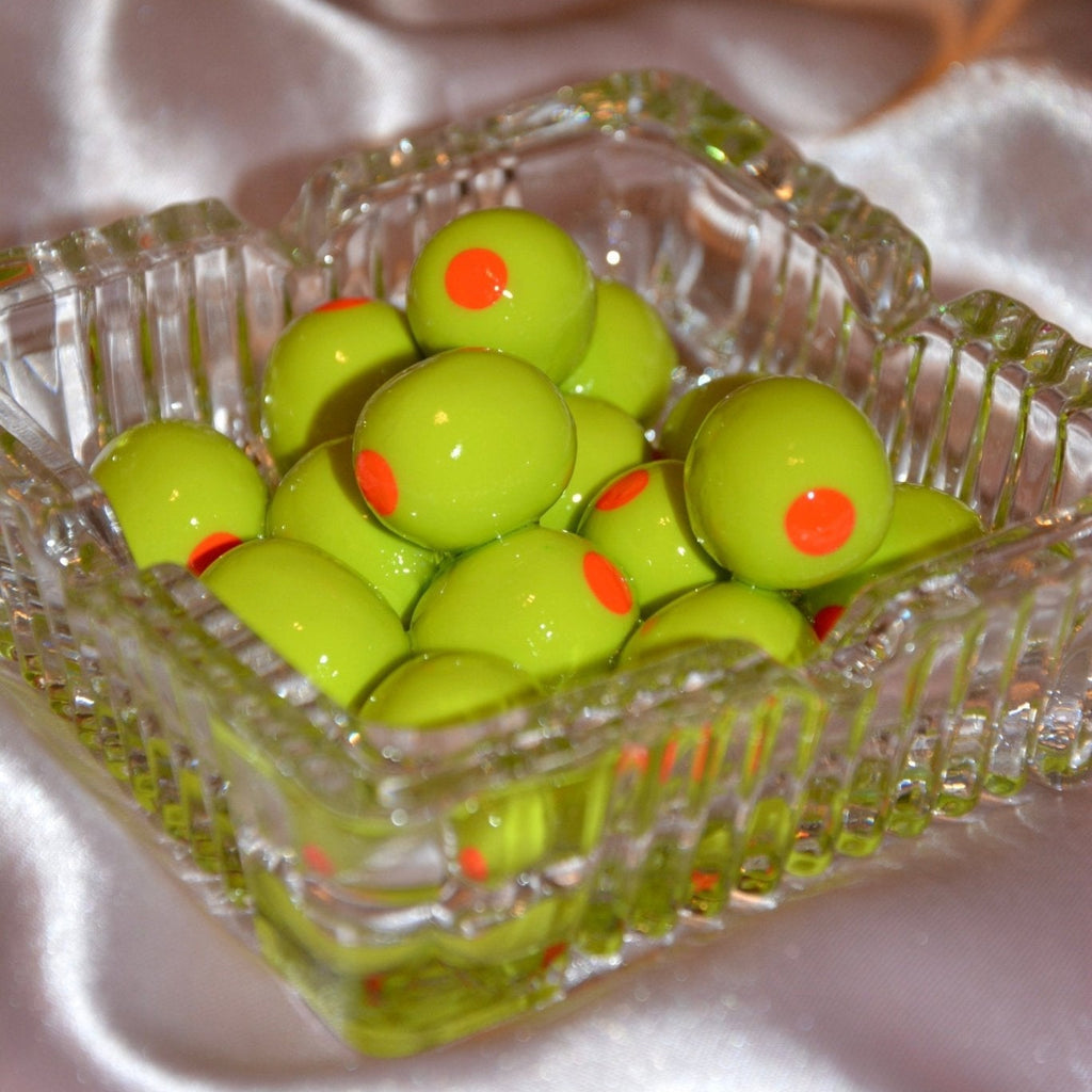 Meet the ultimate fusion of savage chic and sophisticated snacking: a glass ashtray brimming with handcrafted ceramic olives! It’s the kind of avant-garde appetizer that screams elegance with a side of rebellion.
