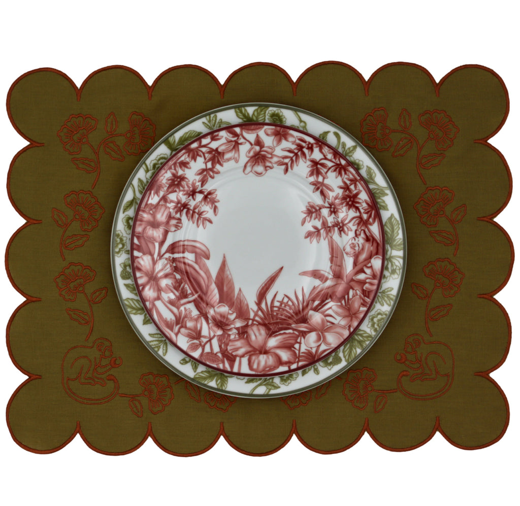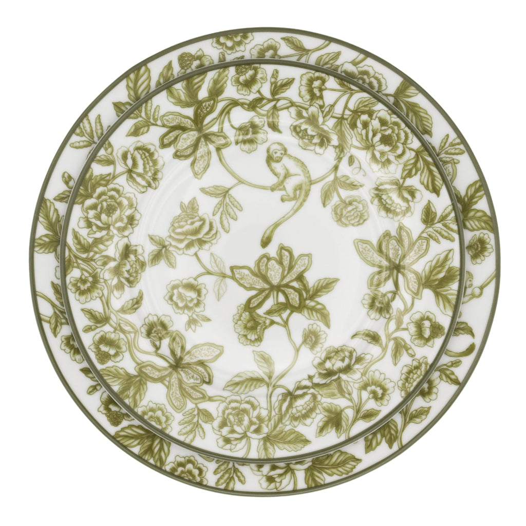Part of our Shimla Social Collection, the Pembroke Safari Dinner Plate captures the whimsy of a dense jungle, intricately painted in a safari green with branching tendrils, lush leaves, and vibrant blooms. The enchanting foliage is displayed around the plate's border, creating a decorative frame and white center. If you look closely enough, you may even be able to spot a monkey hanging off a bough. Can be matched with Shimla Social coordinating pieces to create a complete place setting.