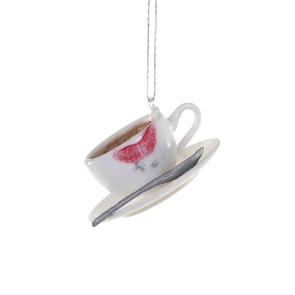 Sip into the season with this whimsical café cup ornament, complete with a charming lipstick-stained rim and matching spoon. Perfect for coffee lovers and holiday decorators who appreciate a touch of humor, this playful piece brings café vibes to your tree. A delightful conversation starter that celebrates the joy of morning coffee and festive cheer.