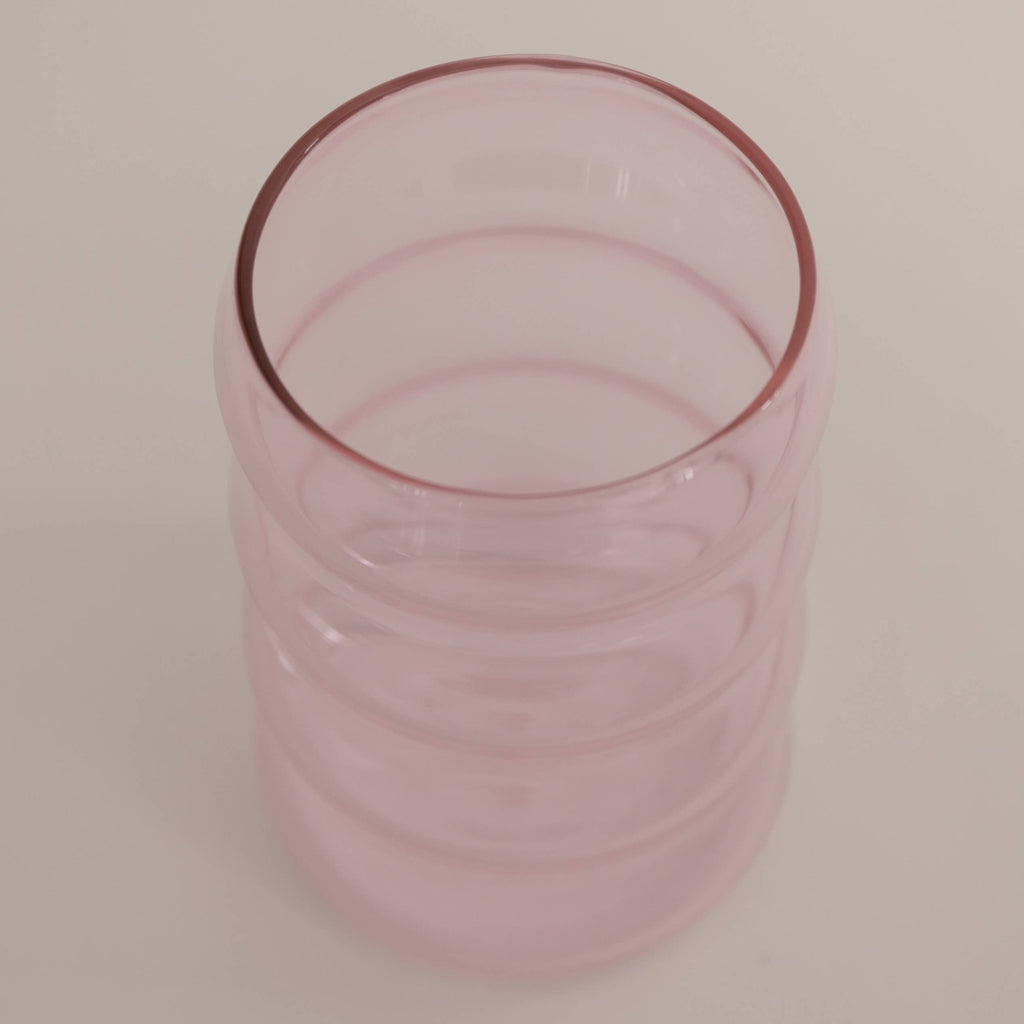 A wavy borosilicate glass drinking cup, perfect for a tall glass of water, beer, mixed drink, iced coffee, smoothie, or any other drink of your preference. Also cute as a small vase.