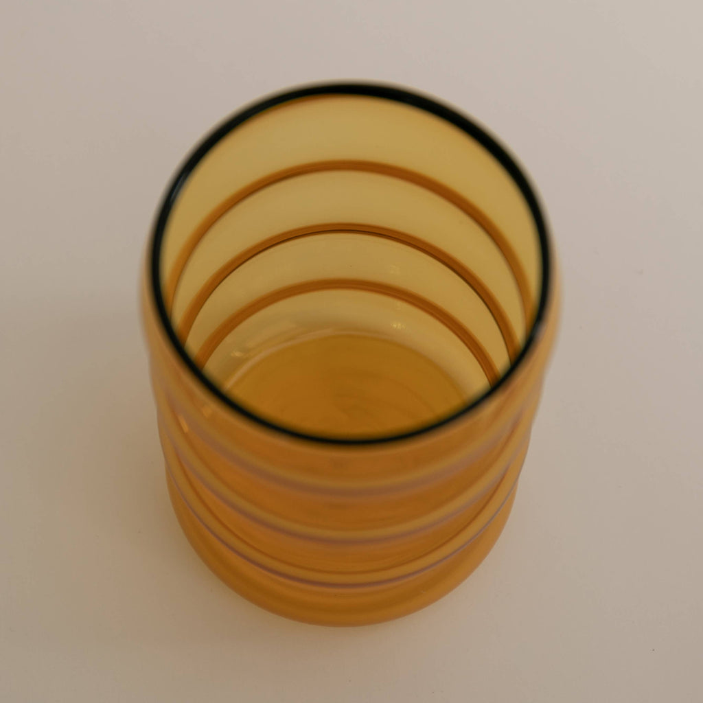 A wavy borosilicate glass drinking cup, perfect for a tall glass of water, beer, mixed drink, iced coffee, smoothie, or any other drink of your preference. Also cute as a small vase.
